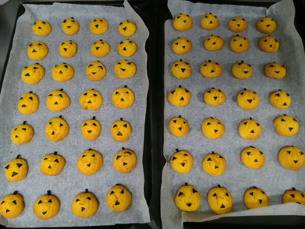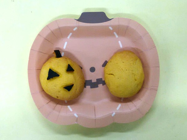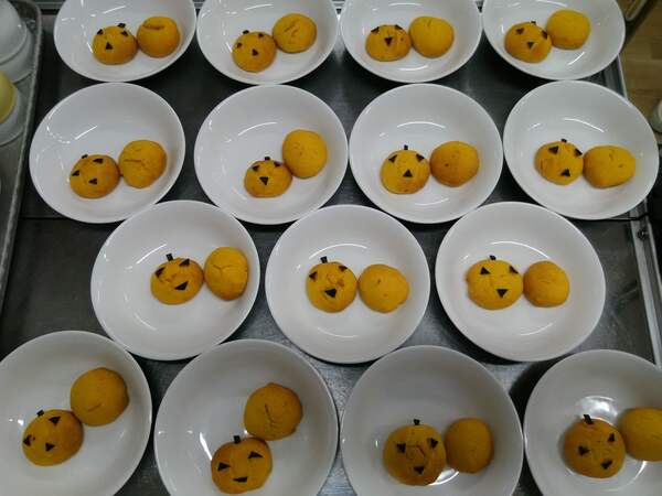 この日のメニューは、かぼちゃを練り込んだソフトクッキー。しっとりとした食感と、かぼちゃの自然な甘みが特徴です。調理担当の職員が、一つひとつ丁寧に、かぼちゃの皮を使ってジャックオランタンの形に仕上げてくれました。