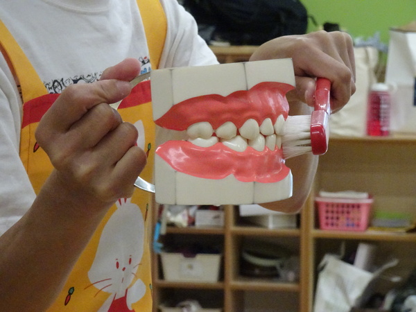 まずはホールで歯の大切さについてのDVDを鑑賞し、その後は各クラスに分かれて歯ブラシを使った歯磨きの練習をしました。赤染め液を使って、磨き残しのチェックも行いました。