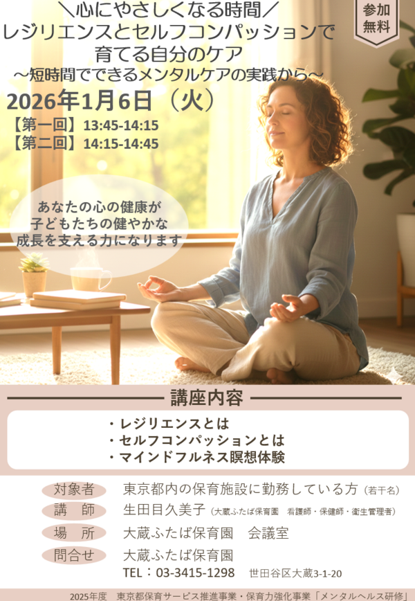 【都内保育施設向け】メンタルヘルス研修「心にやさしくなる時間 レジリエンスとセルフコンパッションで育てる自分のケア〜短時間でできるメンタルケアの実践から」